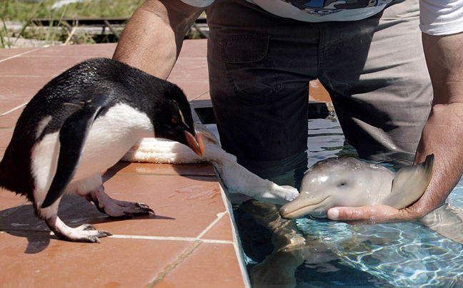 Το μικρό δελφίνι ήταν τραυματισμένο, πιθανόν από δίχτυα ψαράδων, και τώρα αναρρώνει και δέχεται τη φροντίδα και την αγάπη των ανθρώπων που δουλεύουν στο Rescate Fauna Marina, που περιθάλπει τραυματισμένα θηλαστικά.