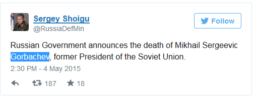 Το θάνατό του ανακοίνωσε στο Twitter και ο υπουργός Εθνικής Άμυνας της Ρωσίας, Sergey Shoigu