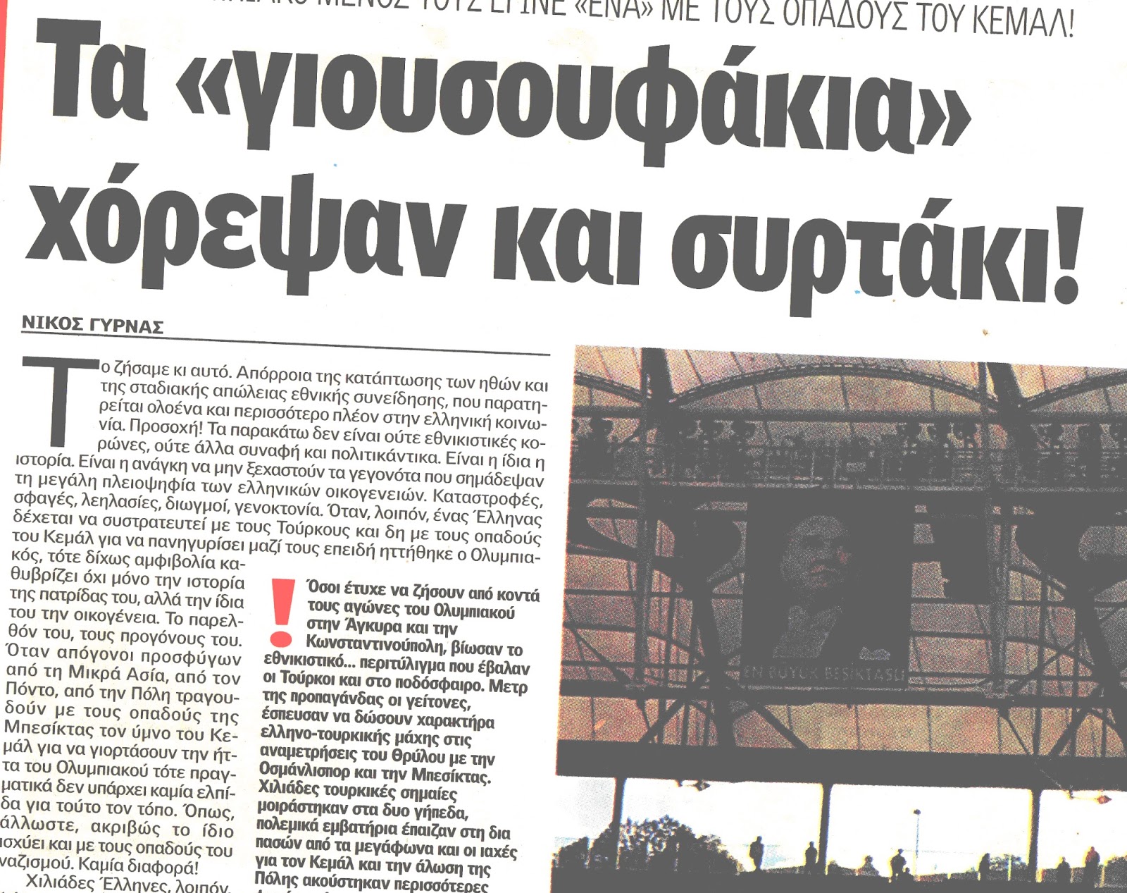Το ζήσαμε κι αυτό. Απόρροια της κατάπτωσης των ηθών και της σταδιακής απώλειας εθνικής συνείδησης, που παρατηρείται ολοένα και περισσότερο πλέον στην ελληνική κοινωνία. Προσοχή! Τα παρακάτω δεν είναι ούτε εθνικιστικές κορώνες, ούτε άλλα συναφή και πολιτικάντικα. Είναι η ίδια η ιστορία. Είναι η ανάγκη να μην ξεχαστούν τα γεγονότα που σημάδεψαν τη μεγάλη πλειοψηφία των ελληνικών οικογενειών. Καταστροφές, σφαγές, λεηλασίες, διωγμοί, γενοκτονία. Όταν, λοιπόν, ένας Έλληνας δέχεται να συστρατευτεί με τους Τούρκους και δη με τους οπαδούς του Κεμάλ για να πανηγυρίσει μαζί τους επειδή ηττήθηκε ο Ολυμπιακός, τότε δίχως αμφιβολία καθυβρίζει όχι μόνο την ιστορία της πατρίδας του, αλλά την ίδια του την οικογένεια. Το παρελθόν του, τους προγόνους του. Όταν απόγονοι προσφύγων από τη Μικρά Ασία, από τον Πόντο, από την Πόλη τραγουδούν με τους οπαδούς της Μπεσίκτας τον ύμνο του Κεμάλ για να γιορτάσουν την ήττα του Ολυμπιακού τότε πραγματικά δεν υπάρχει καμία ελπίδα για τούτο τον τόπο. Όπως, άλλωστε, ακριβώς το ίδιο ισχύει και με τους οπαδούς του ναζισμού. Καμία διαφορά!