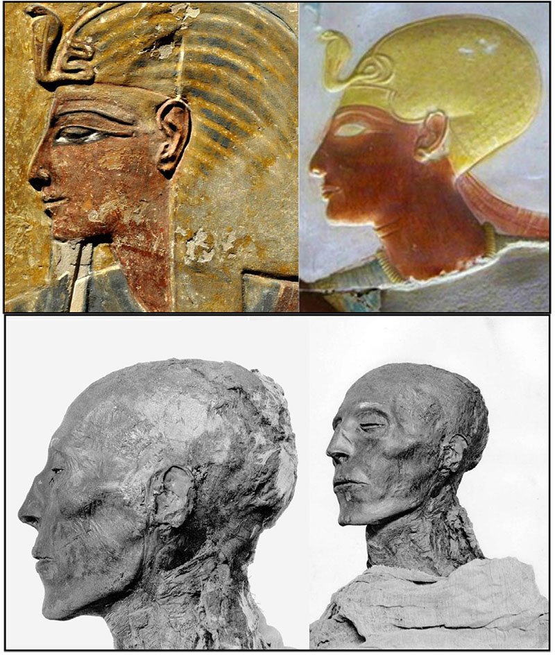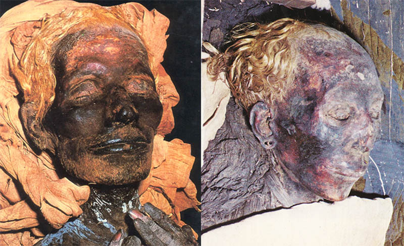 Φώτο αριστερά: Ο Yuya, ένας Αιγύπτιος ευγενής από το 1400 π.Χ. Πατέρας της Tiy, της συζύγου του Φαραώ Αμενχοτέπ ΙΙΙ. Τα ξανθά μαλλιά του Yuya είναι καλά διατηρημένα με τη διαδικασία της ταρίχευσης. Το ίδιο και τα εξίσου ξανθιά μαλλιά της συζύγου του, Thuya, προγιαγιάς του Τουταγχαμών.