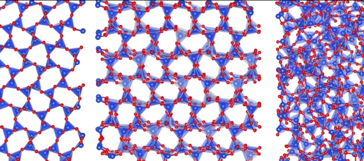 Η αύξηση της αταξίας στη δομή των ατόμων των υλικών επηρεάζει την μακροσκοπική αγωγιμότητα θερμότητας — μια κρίσιμη ιδιότητα για τις τεχνολογίες διαχείρισης θερμότητας. Τα υλικά που μελετήθηκαν περιλαμβάνουν κρυσταλλικό μετεωρίτη τριδύμιτη (αριστερά), μια φάση τριισοπροπανολαμίνης που διαθέτει κρυσταλλική τάξη δεσμών και αμόρφη γεωμετρία δεσμών (κέντρο) και πλήρως αμόρφο γυαλί πυρίτιο (δεξιά). Το κόκκινο αναπαριστά το οξυγόνο (Ο), το μπλε το πυρίτιο (Si), και οι κοινές τετραεδρικές διατάξεις SiO4 επισημαίνονται με σκιασμένο μπλε. Φωτογραφία: Εργαστήριο Simoncelli