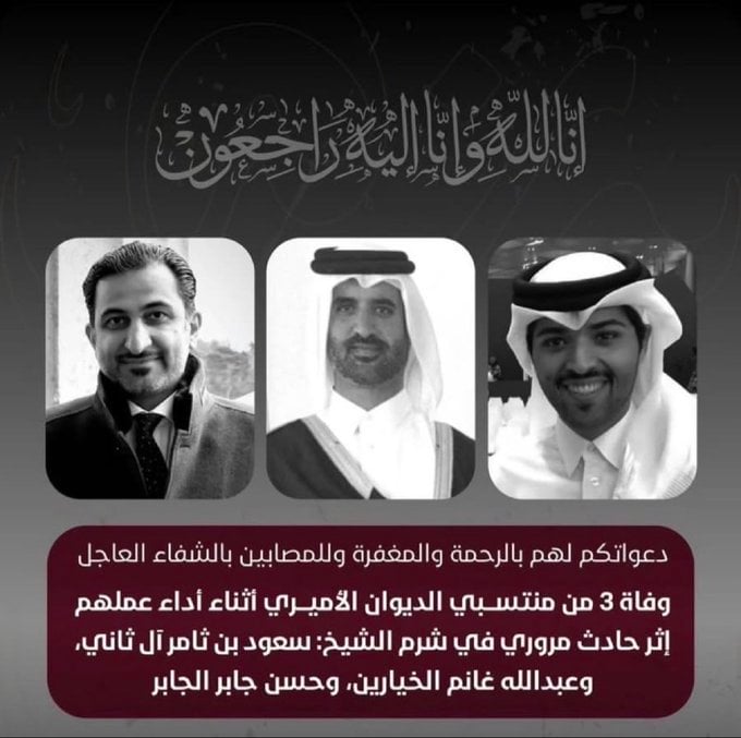 Τρία μέλη του διπλωματικού σώματος του Κατάρ σκοτώθηκαν σε τροχαίο στο Σαρμ ελ Σέιχ, στην Ερυθρά Θάλασσα και ακόμη δυο διπλωμάτες τραυματίστηκαν, σύμφωνα με ενημέρωση του πρακτορείου Reuters.