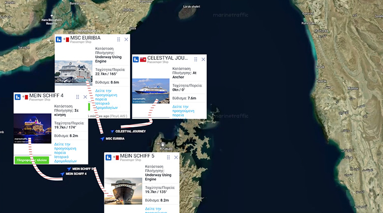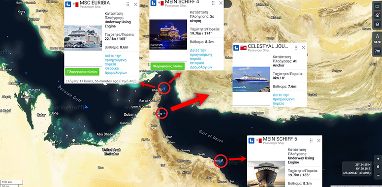 Σύμφωνα με τα στοιχεία του MarineTraffic, το «MSC Euribia» βρίσκεται πλέον κοντά στο Κασάμπ του Ομάν, όπως και το «Mein Schiff 4». Το «Mein Schiff 5» εντοπίζεται στα ύδατα του Μουσκάτ στο Ομάν, ενώ το «Celestyal Journey» είναι στον Κόλπο του Ομάν, στο ύψος της Νάχουα.