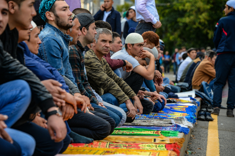 21.08.2018. Russia. Moscow. Muslims during prayer at the Moscow Cathedral Mosque on the day of the Eid al-Adha sacrifice holiday.