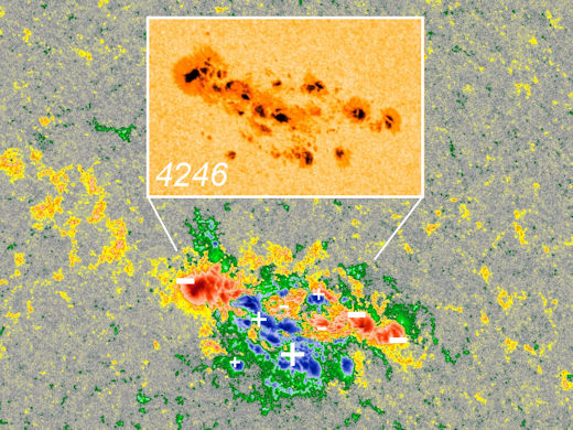 Οι περισσότερες ηλιακές κηλίδες έχουν μια απλή μαγνητική διαμόρφωση, παρόμοια με αυτή ενός κοινού ραβδοειδούς μαγνήτη. Η κοντινή ηλιακή κηλίδα 4248 είναι ένα καλό παράδειγμα. Ωστόσο, η ηλιακή κηλίδα 4246 είναι διαφορετική. Έχει αρκετούς μαγνητικούς πόλους, διατεταγμένους τυχαία κοντά.