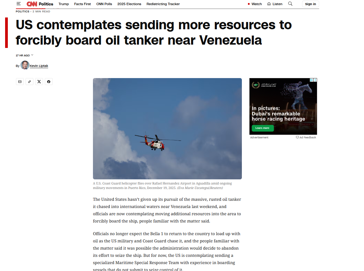 Τον Δεκέμβριο του 2025, η Ακτοφυλακή και ο στρατός των ΗΠΑ ενέτειναν τις επιχειρήσεις τους κατά δεξαμενόπλοιων κοντά στη Βενεζουέλα, καταλαμβάνοντας το υπερδεξαμενόπλοιο Skipper στα ανοικτά της Καραϊβικής στις 10 Δεκεμβρίου — μια κίνηση που χαρακτηρίστηκε από πολλούς ως αμφιλεγόμενη κλιμάκωση των αμερικανικών ναυτικών επιχειρήσεων στην περιοχή.