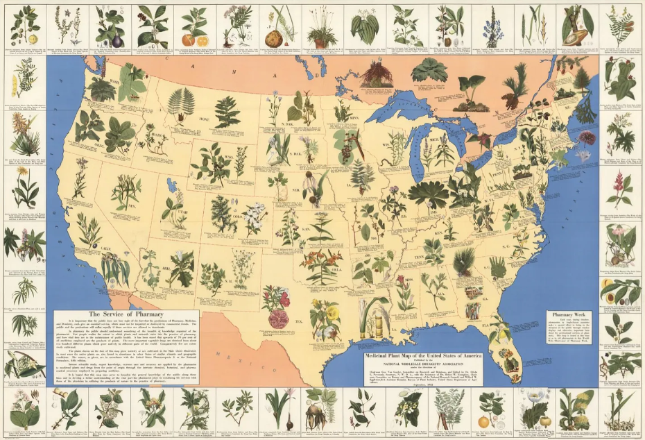 Για τρεις ακόμη δεκαετίες μετά το εγχειρίδιο του 1899, η φυσική ιατρική διατήρησε τη θέση της. Στη συνέχεια, το 1932, το αμερικανικό φαρμακευτικό επάγγελμα δημοσίευσε κάτι εξαιρετικό: έναν χάρτη μεγάλου μεγέθους των φαρμακευτικών φυτών που χρησιμοποιούν συνήθως οι φαρμακοποιοί και το κοινό. Κάνναβη. Λοβέλια. Χρυσή σέλα. Κασκάρα. Εχινάκεια. Δεκάδες βότανα, χαρτογραφημένα γεωγραφικά, διανεμημένα δημόσια, υπό τον τίτλο «Η Υπηρεσία της Φαρμακευτικής».