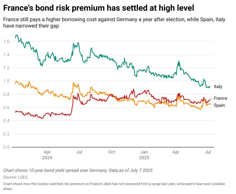 Ωστόσο, το ρίσκο που πληρώνει το γαλλικό χρέος σε σχέση με το γερμανικό παραμένει υψηλό, φτάνοντας τις 70 μονάδες βάσης, πολύ πάνω από τα 50 μ.β. που παρατηρούνταν πριν από τις αιφνιδιαστικές εκλογές που προκήρυξε ο Πρόεδρος Emmanuel Macron το περασμένο καλοκαίρι.