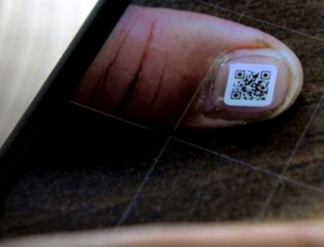 Η αυτοκόλλητη σφραγίδα για τα νύχια, με κώδικα QR – μέρος μιας δωρεάν υπηρεσίας που ξεκίνησε αυτό το μήνα και για πρώτη φορά στην Ιαπωνία – έχει μέγεθος μόνο ένα εκατοστό (0,4 ίντσες).