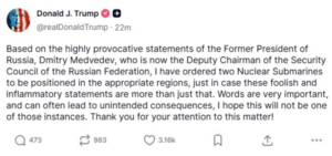 Η ανακοίνωση περί πυρηνικών υποβρυχίων έγινε μέσω της πλατφόρμας του Truth Social. «Με βάση τις εξαιρετικά προκλητικές δηλώσεις του πρώην προέδρου της Ρωσίας, Ντμίτρι Μεντβέντεφ, ο οποίος είναι πλέον αναπληρωτής πρόεδρος του Συμβουλίου Ασφαλείας της Ρωσικής Ομοσπονδίας, έδωσα εντολή να τοποθετηθούν δύο πυρηνικά υποβρύχια στις κατάλληλες περιοχές», έγραψε.
