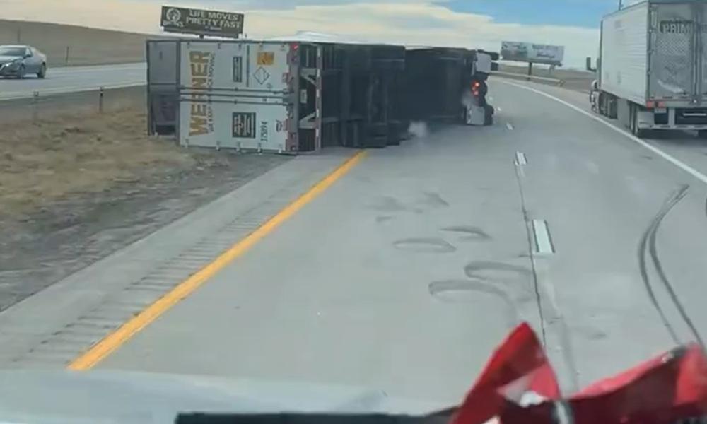 Caught on camera: Watch as a semi flips over from strong winds along I-25 in Wyoming. pic.twitter.com/J6LpeKeda5