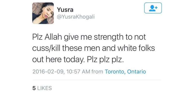 Σε ένα tweet του περασμένου έτους, η Khogali ζήτησε από τον “Αλλάχ” τη δύναμη να μην σκοτώσει “λευκούς”.