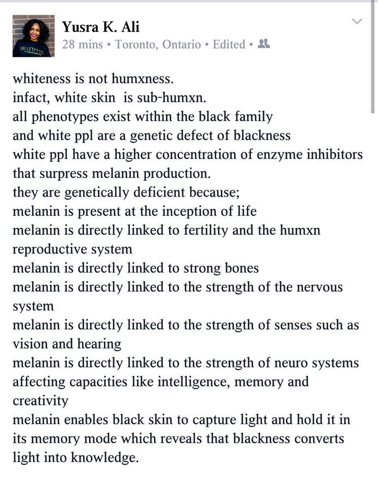 Η Yusra Khogali έγραψε στο Facebook ότι «η λευκή φυλή δεν ανήκει στους ανθρώπους» (“Whiteness is not humxness”) και ότι «το λευκό δέρμα είναι υπάνθρωπο» (“white skin is sub-humxn”), σύμφωνα με την Toronto Sun. Η Khogali σκόπιμα δεν γράφει καθαρά την λέξη “human”, προκειμένου να εξαλειφθεί το “man” (άνδρας) από τη λέξη, μια κοινή πρακτική των αριστερών φεμινιστριών.