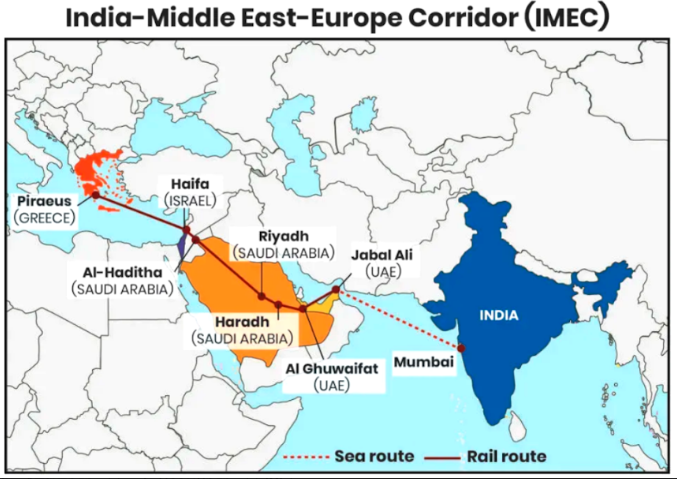 Στις 9 Σεπτεμβρίου 2023, οι κυβερνήσεις της Ινδίας, των ΗΠΑ, της Σαουδικής Αραβίας, των ΗΑΕ, της Γαλλίας, της Γερμανίας, της Ιταλίας και της Ευρωπαϊκής Ενώσεως (προσέξατε την εκτόπιση της Μεγάλης Βρετανίας;) υπέγραψαν Μνημόνιο Συνεργασίας στη Σύνοδο Κορυφής των χωρών G20 στο Νέο Δελχί. Εκεί το έργο το ονόμασαν Οικονομικό Διάδρομο Ινδίας-Μέσης Ανατολής-Ευρώπης. Το έργο έχει δύο τρωτά σημεία. Το ένα είναι το στενό του Ορμούζ που ελέγχεται από το Ιράν και το οποίο πρέπει να πάψει να είναι τρωτό, και γι αυτό έχουμε πόλεμο. Το άλλο τρωτό σημείο είναι η Ελλάς, ο Πειραιάς, του οποίου το λιμάνι αγοράστηκε από τους κινέζους. Προσέξτε εδώ. Η Ελλάς δέχεται ύπουλη επίθεση από το Ισραήλ και είναι κοντά στο να γίνει επαρχία του Ισραήλ. Ο λιμένας Πειραιώς πρέπει να φύγει από τους κινέζους και να αποδοθεί στις χώρες του IMEC, δηλαδή στο Ισραήλ. Αν δεν γίνει αυτό τότε θα λύσουν το πρόβλημα… οι τούρκοι με εισβολή, θα έχουμε νέα δεδομένα, και γι αυτό αποστρατιωτικοποιούν την Ελλάδα. Το σχέδιο πρέπει να πετύχει. Ο νέος δρόμος θα είναι απλούστερος. Ινδία, Σαουδική Αραβία, Μεγάλο Ισραήλ, Ευρώπη.