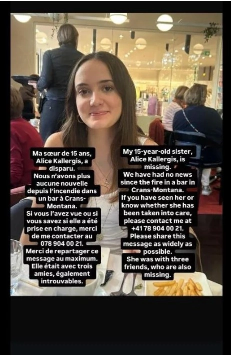 Η 15χρονη Ελληνίδα Αλίκη Καλλέργη, έχασε τη ζωή της από την καταστροφική πυρκαγιά στο μπαρ Le Constellation στο Κραν Μοντανά της Ελβετίας, κατά τη διάρκεια των εορτασμών για την Πρωτοχρονιά. Στην άτυπη λίστα των αγνοουμένων συγκαταλέγονται και φίλοι της ίδιας και του αδελφού της, την ώρα που οι συγγενείς αναζητούν απεγνωσμένα οποιοδήποτε ίχνος ζωής.