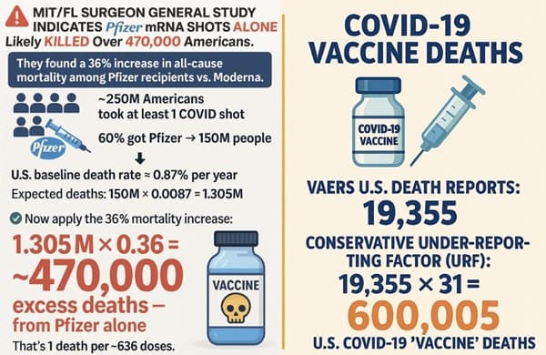 Αυτό υποστηρίζει τη πολύ συντηρητική εκτίμηση ότι οι θάνατοι που προκλήθηκαν εξαιτίας των εμβόλιων κατά του COVID-19 στις ΗΠΑ, ότι ανέρχεται σε τουλάχιστον 470.000 έως 600.000 ανθρώπους: