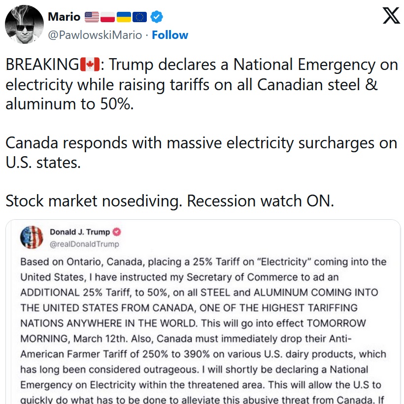 Αυτό ακολουθεί το εκτελεστικό διάταγμα του Τραμπ της 1ης Φεβρουαρίου 2025 που επιβάλλει δασμούς 25% σε καναδικά αγαθά, εκτός από το πετρέλαιο και την ενέργεια, τα οποία αντιμετωπίζουν δασμούς 10%, σύμφωνα με τον Νόμο για τις Οικονομικές Εξουσίες Διεθνούς Έκτακτης Ανάγκης.