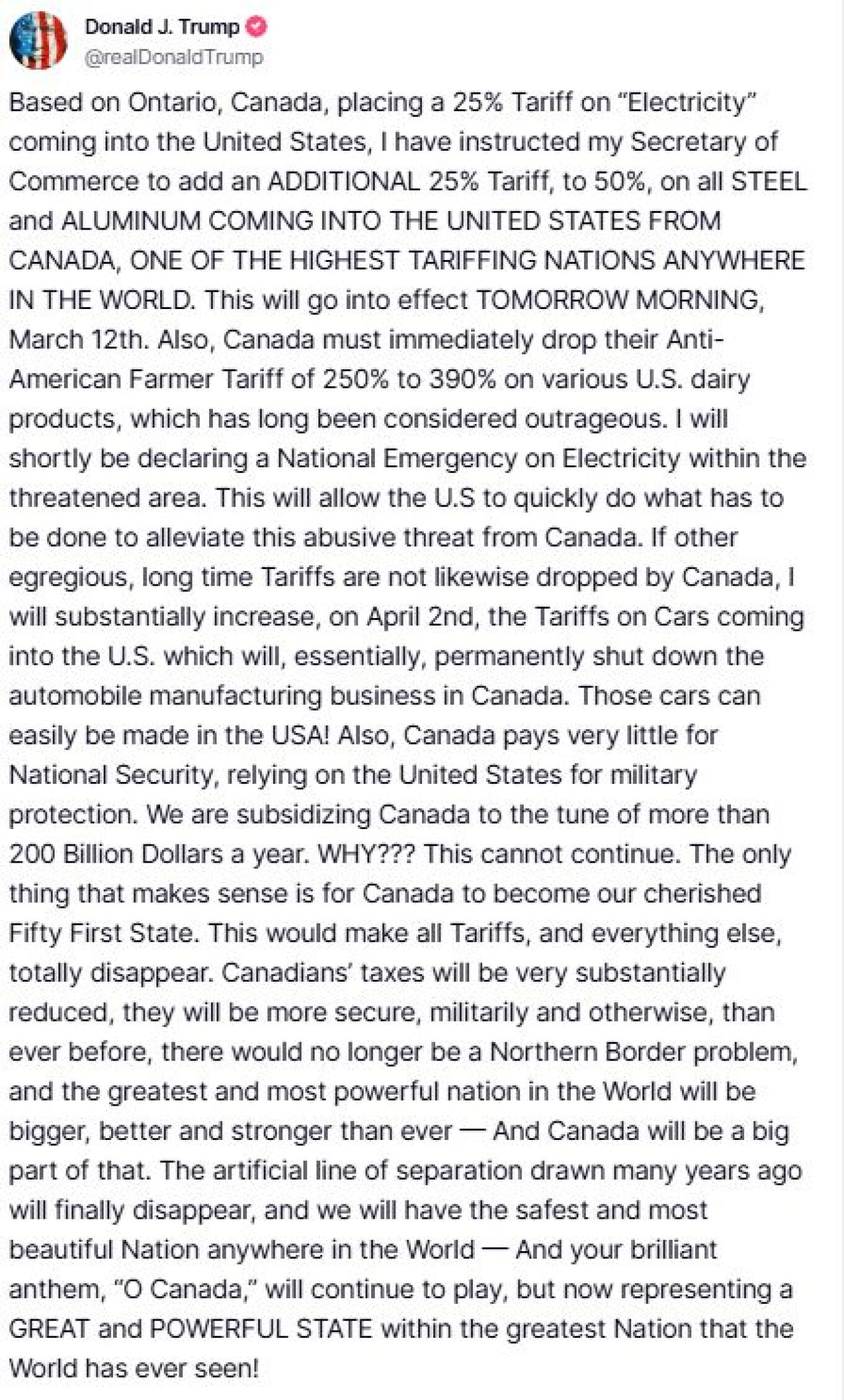 Ο Ντόναλντ Τραμπ με ανάρτησή του σε μέσα κοινωνικής δικτύωσης και ένα μακροσκελές κείμενο ανακοίνωσε πως επιβάλλει άμεσα ακόμη 25% δασμούς προς την Οτάβα στις εισαγωγές χάλυβα και σιδήρου. Μάλιστα ο Τραμπ σημειώνει πως το σημερινό 25% θα ξεκινήσει να επιβάλλεται από αύριο και θα αθροιστεί με το 25% που έχει ήδη αποφασίσει και υπογράψει – αλλά έχει προς το παρόν «παγώσει» μέχρι τις 2 Απριλίου.