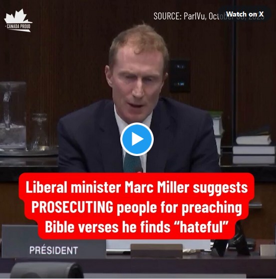 Ο Μαρκ Μίλερ, ο τύπος στο βίντεο, γνωστός και ως ο βουλευτής του Μόντρεαλ που διορίστηκε πρόσφατα Υπουργός Πολιτισμού, Γλωσσών και κάτι άλλο, απαιτεί όχι μόνο την κατάργηση της τροπολογίας, αλλά και την επιβολή πρόσθετης ποινής φυλάκισης στον πάστορα επειδή παρέθεσε απόσπασμα από τη Βίβλο. Έτσι, αν ένας πάστορας πει κάτι αρνητικό για έναν ομοφυλόφιλο ιερέα, θα πρέπει να τιμωρηθεί με πέντε χρόνια φυλάκιση βάσει του νέου νόμου. Αλλά αν ο πάστορας παραθέσει επίσης ένα απόσπασμα από τη Βίβλο που λέει κάτι αρνητικό για τους ομοφυλόφιλους, θα πρέπει να τιμωρηθεί με 15 χρόνια φυλάκιση ή ακόμα και με τη θανατική ποινή, κάτι τέτοιο.