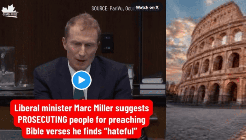Ο Μαρκ Μίλερ, ο τύπος στο βίντεο, γνωστός και ως ο βουλευτής του Μόντρεαλ που διορίστηκε πρόσφατα Υπουργός Πολιτισμού, Γλωσσών και κάτι άλλο, απαιτεί όχι μόνο την κατάργηση της τροπολογίας, αλλά και την επιβολή πρόσθετης ποινής φυλάκισης στον πάστορα επειδή παρέθεσε απόσπασμα από τη Βίβλο. Έτσι, αν ένας πάστορας πει κάτι αρνητικό για έναν ομοφυλόφιλο ιερέα, θα πρέπει να τιμωρηθεί με πέντε χρόνια φυλάκιση βάσει του νέου νόμου. Αλλά αν ο πάστορας παραθέσει επίσης ένα απόσπασμα από τη Βίβλο που λέει κάτι αρνητικό για τους ομοφυλόφιλους, θα πρέπει να τιμωρηθεί με 15 χρόνια φυλάκιση ή ακόμα και με τη θανατική ποινή, κάτι τέτοιο.