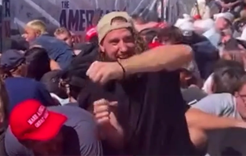 Καταγράφηκε να φωνάζει «USA, USA, USA!» με τις δύο γροθιές του στον αέρα, θυμίζοντας τον πρόεδρο των ΗΠΑ, Ντόναλντ Τραμπ, μετά την απόπειρα δολοφονίας του σε μια συγκέντρωση στο Μπάτλερ της Πενσιλβάνια το περασμένο καλοκαίρι.