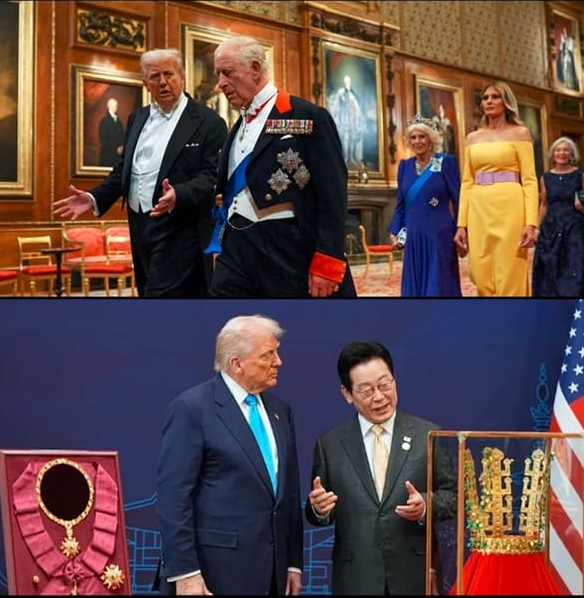 Πριν από λίγο καιρό ο Τραμπ είχε επισκεφθεί τον Βασιλιά της Αγγλίας, Κάρολο τον Γ’. Το όλο τελετουργικό θύμιζε ότι ο Κάρολος υποδεχόταν έναν νέο Βασιλιά ή εν πάση περιπτώσει κάποιον ομότιμό του. Ο Τραμπ δεν έτυχε πολιτικής υποδοχής, αλλά βασιλικής. Ο Κάρολος όμως θεωρείται ο ισχυρότερος Βασιλιάς του κόσμου, άρα και ο Τραμπ θεωρήθηκε από κάποιους πολιτικούς αναλυτές ομότιμός του ή μπορεί και να εστέφθη κρυφά, αλλά σε κοινή θέα, ως νέος βασιλιάς από τον Κάρολο! Από το όλο τελετουργικό έλειπε το στέμμα, η κορώνα του «βασιλιά» Τραμπ. Το στέμμα το οποίο αποτελεί το χαρακτηριστικό αντικείμενο ενός βασιλιά. Αυτό δόθηκε στον Τραμπ τώρα! Στις 30 Οκτωβρίου. Στην Νότιο Κορέα ο Πρόεδρος της Νοτίου Κορέα, Lee Jae Myung, δώρισε στον Τραμπ ένα βασιλικό στέμμα αντίγραφο στέμματος αρχαίου(!) Κορεάτη Βασιλέως. Το στέμμα αυτό είναι διακοσμημένο με φιγούρες της θεάς Durga, της θεάς της δύναμης, μητρότητος, προστασίας, αλλά και της μάχης. Ο Τραμπ μόλις το είδε είπε ότι: Θέλω να το φορέσω τώρα αμέσως!