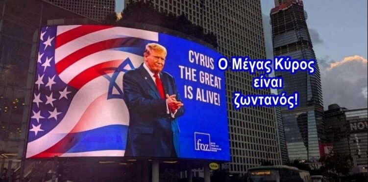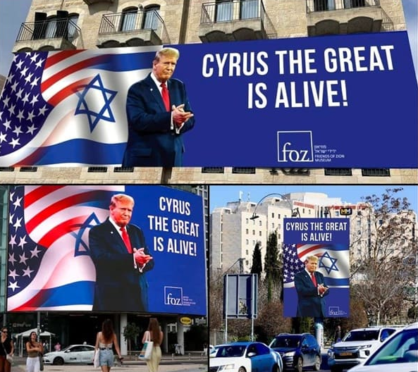 Βλέπουμε λοιπόν ότι ο Τραμπ «βασιλίζει» και οι διαδηλωτές δεν θέλουν βασιλιά στις ΗΠΑ. Οι Αμερικανοί είναι διάσημοι για την άγνοια της γεωγραφίας και Ιστορίας και μάλλον δεν γνωρίζουν για το τι διαδηλώνουν. Ο Τραμπ δεν θέλει να γίνει Βασιλιάς στις ΗΠΑ. Ο Τραμπ θέλει κάτι μεγαλύτερο, θέλει να είναι ο Κύρος ο Μέγας. Να είναι! Να είναι ο Κύρος, και όχι να είναι μετά τον Κύρο ή σαν τον Κύρο. Ακούγεται λίγο τραβηγμένο έως παρανοϊκό! Αλλά τα γεγονότα λένε την αλήθεια. Οι Ιουδαίοι στο Ισραήλ γέμισαν τους δρόμους με γιγαντοαφίσες που εικονίζουν τις σημαίες των ΗΠΑ και Ισραήλ αδελφωμένες, τον Τραμπ, και την επιγραφή «Ο Κύρος ο Μέγας είναι ζωντανός». Το προσέξατε; «ΕΙΝΑΙ ζωντανός»! Μας το παρουσιάζουν λες και ο Τραμπ είναι χρονοταξιδιώτης ή κάτι άλλο! Οι γιγαντοαφίσες φέρουν και το λογότυπο, προφανώς είναι χορηγία, της “FOZ” που σημαίνει “Friends of Zion – Museum”, δηλαδή «Φίλοι της Σιών – Μουσείο».