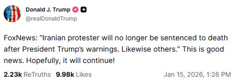 Ο Τραμπ ανακοίνωσε, επίσης, μέσω της πλατφόρμας Truth Social, ότι το Fox είχε αναφέρει πως το Ιράν δεν θα εκτελέσει εν τέλει τον Ιρανό διαδηλωτή Erfan Soltani.