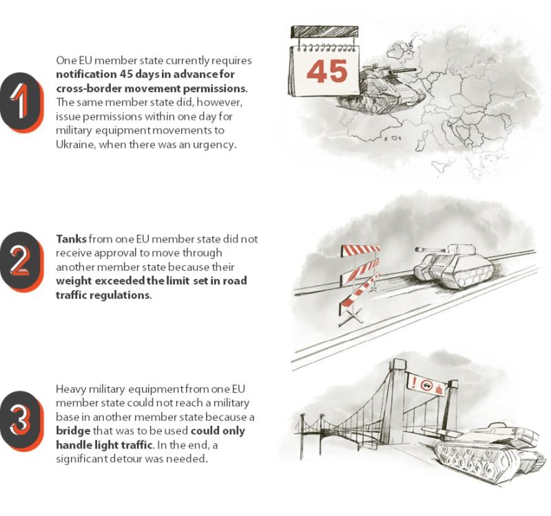 Για παράδειγμα, τα άρματα μάχης από μια χώρα της ΕΕ δεν μπορούν να ταξιδέψουν μέσω του εδάφους μιας άλλης εάν το βάρος τους υπερβαίνει το επιτρεπόμενο όριο που προβλέπεται από τους κανονισμούς κυκλοφορίας. Επί του παρόντος, υπό κανονικές συνθήκες, μια χώρα της ΕΕ απαιτεί ειδοποίηση 45 ημερών για άδεια διέλευσης συνόρων.