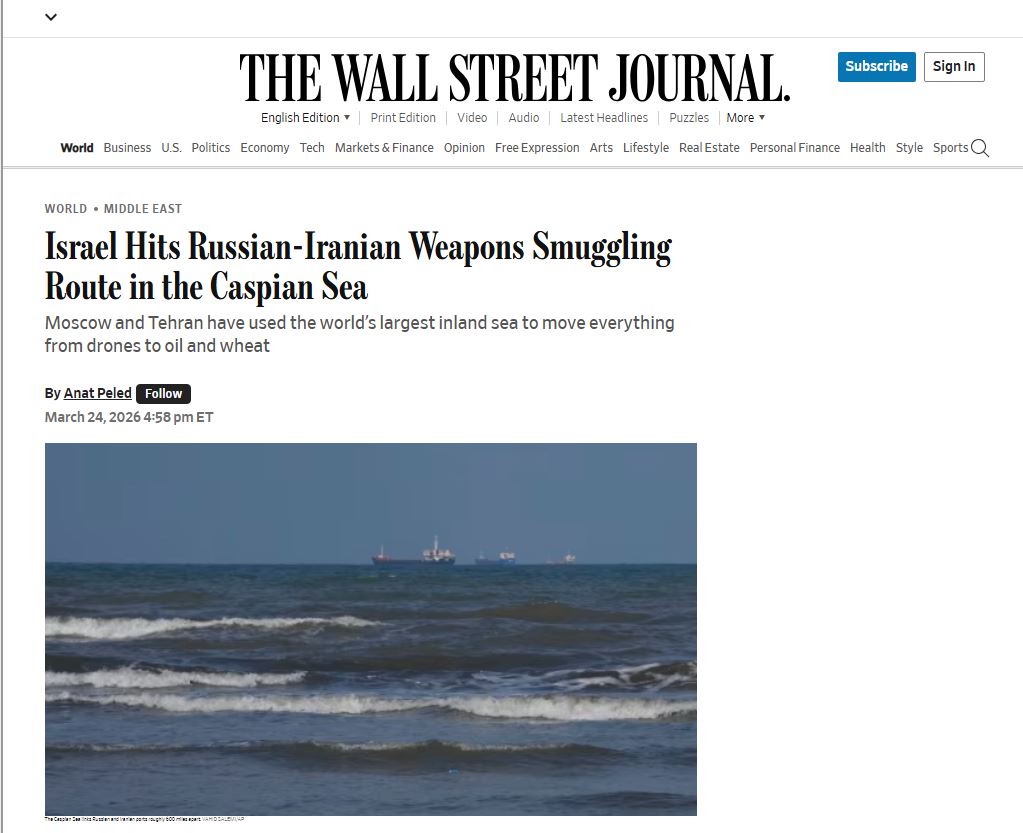 Συγκεκριμένα ένα ισραηλινό πλήγμα σε ναυτικό φυλάκιο στην Κασπία Θάλασσα, στις 25/3, στόχευσε τη ρωσική υποστήριξη προς το Ιράν στον πόλεμο, χτυπώντας μια γραμμή ανεφοδιασμού που οι χώρες χρησιμοποιούν για τη μεταφορά πυρομαχικών, drones και άλλων οπλικών συστημάτων, δήλωσαν άτομα που γνωρίζουν το θέμα στο αμερικανικό έντυπο.