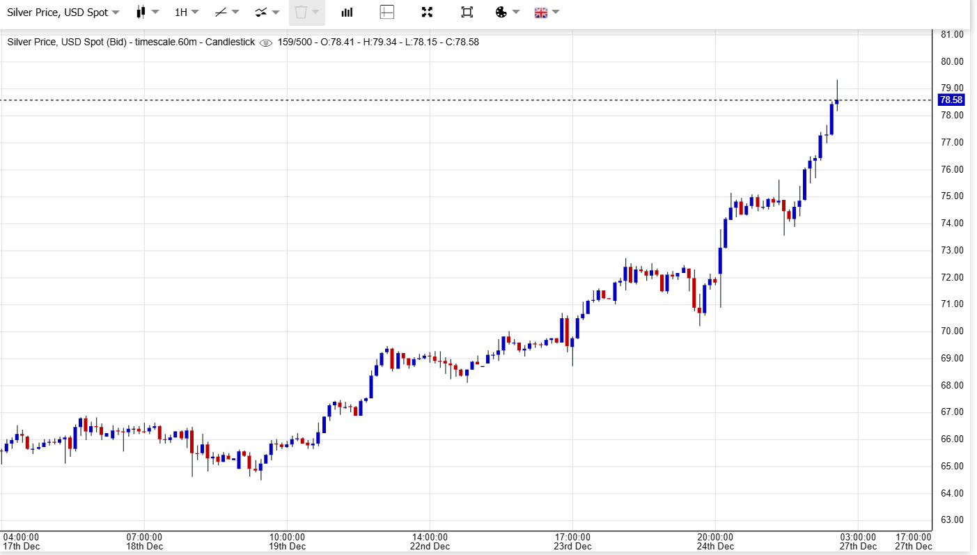 Την Παρασκευή (26/12), το πολύτιμο μέταλλο κατέγραψε άνοδο 6,29%, φτάνοντας τα 76,37 δολάρια ανά ουγγιά, με συνολική αύξηση 159% από την αρχή του έτους — διπλάσια και πλέον από την άνοδο του χρυσού.