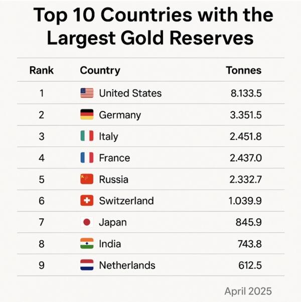 Τα επίσημα αποθέματα της χώρας ανέρχονται σε 3.352 τόνους, πίσω μόνο από τις Ηνωμένες Πολιτείες, 8.133 τόνους.