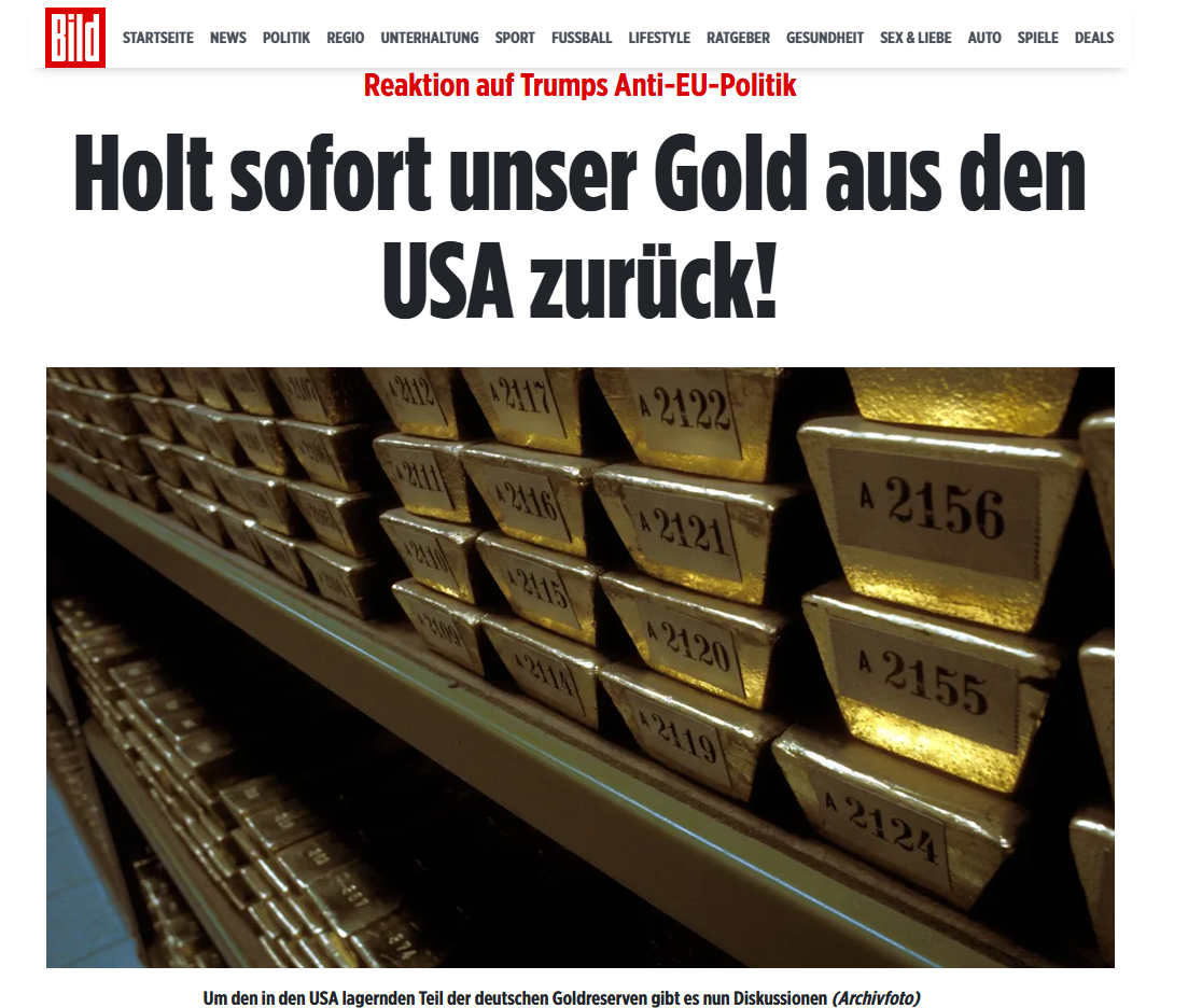 Αυτό το απόσπασμα είναι από ένα άρθρο της Bild με δραματικό τίτλο «Φέρτε αμέσως τον χρυσό μας πίσω από τις ΗΠΑ»: Δεν αποτελεί έκπληξη ότι η επιθυμία του Προέδρου Donald Trump να ελέγξει τα αποθέματα χρυσού του Fort Knox δεν έχει εμπνεύσει εμπιστοσύνη στις ξένες κυβερνήσεις που αποθηκεύουν τον χρυσό τους στις Ηνωμένες Πολιτείες.
