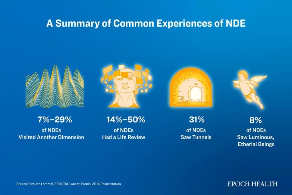 Παρομοίως, ο Δρ Sam Parnia, ιατρός και ερευνητής, παρατήρησε ότι το επτά τοις εκατό των ασθενών που αναζωογονήθηκαν αφηγήθηκαν επισκέψεις σε μια απόκοσμη διάσταση κατά τη διάρκεια της εμπειρίας τους κοντά στο θάνατο (NDE) – μια εμπειρία που οι άνθρωποι μερικές φορές έχουν στο χείλος του θανάτου και μπορεί να τη θυμούνται μετά την ανάρρωση. Επιπλέον, ο Δρ Pim van Lommel, καρδιολόγος από την Ολλανδία, ανέφερε ότι το 29% των ανθρώπων με ΝΕD περιγράφουν την είσοδο σε ένα τεράστιο, όμορφο βασίλειο πέρα από τη φυσική μας πραγματικότητα.