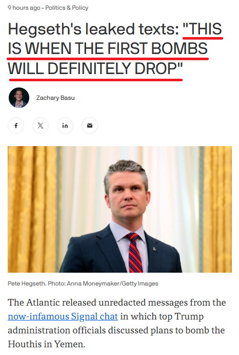 Ο σύνδεσμος για αυτόν τον τίτλο του Drudge οδήγησε σε ένα άρθρο του Axios σχετικά με την “(υποτιθέμενη) τυχαία απελευθέρωση μυστικών πολεμικών σχεδίων” που σχετίζεται με την επίθεση των ΗΠΑ στους Χούτι (η δύναμη πληρεξουσίου του Ιράν στην Υεμένη). Αλλά υποψιάζομαι έντονα ότι αυτές οι ιστορίες διαδίδονται έτσι ώστε τα τσιράκια να μπορούν να προετοιμαστούν για την ημέρα που οι ΗΠΑ θα επιτεθούν στο Ιράν.
