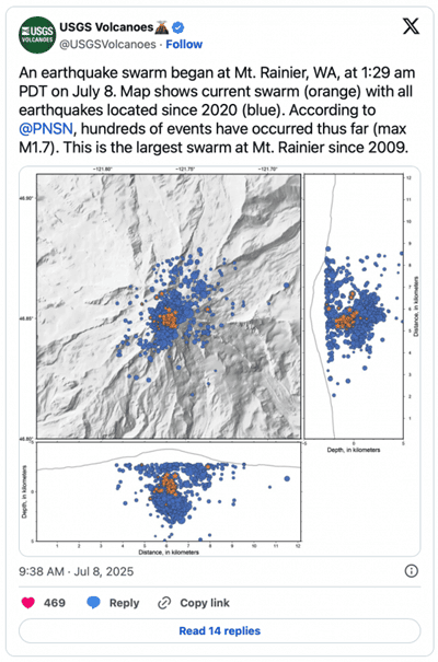 Σύμφωνα με το USGS, αυτό ήταν το μεγαλύτερο σμήνος σεισμών που έχουμε δει στο Όρος Ρέινιερ από το 2009.