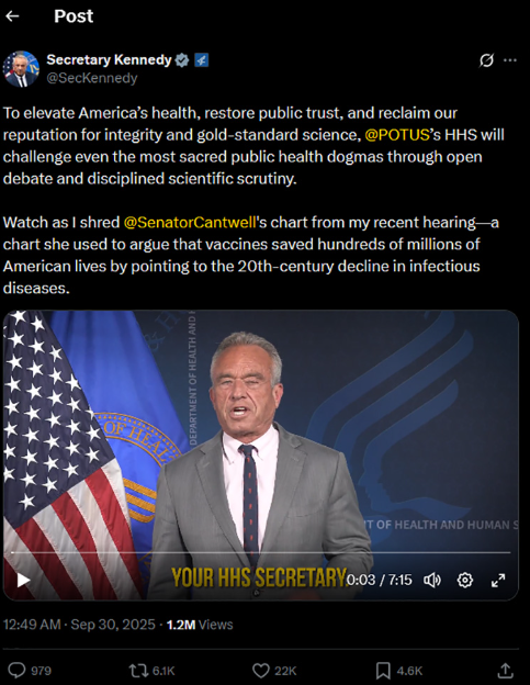 Ο Υπουργός Υγείας των ΗΠΑ Robert F. Kennedy Jr. στις 29 Σεπτεμβρίου, μέσω βίντεο που ανήρτησε στην πλατφόρμα κοινωνικής δικτύωσης Χ, αμφισβήτησε τον κοινό ισχυρισμό ότι τα εμβόλια κατά ασθενειών όπως η ιλαρά και η πολιομυελίτιδα έχουν αποτρέψει εκατοντάδες εκατομμύρια θανάτους.