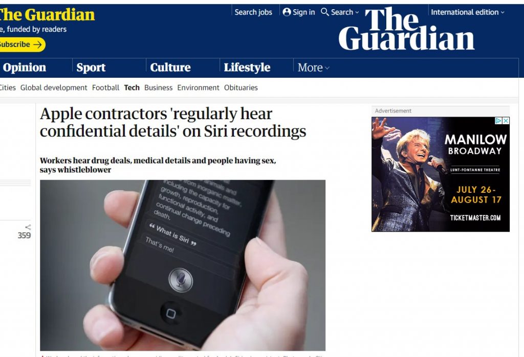 Σάλος έχει προκληθεί με τις νέες αποκαλύψεις ότι η Siri στέλνει ηχογραφήσεις που αφορούν σεξουαλικές επαφές, ιατρικές πληροφορίες, συναλλαγές που αφορούν ναρκωτικά και άλλες προσωπικές στιγμές των ιδιοκτήτων χωρίς φυσικά να το γνωρίζουν, προς αξιολόγηση σε συνεργάτες της εταιρείας ανά τον κόσμο.