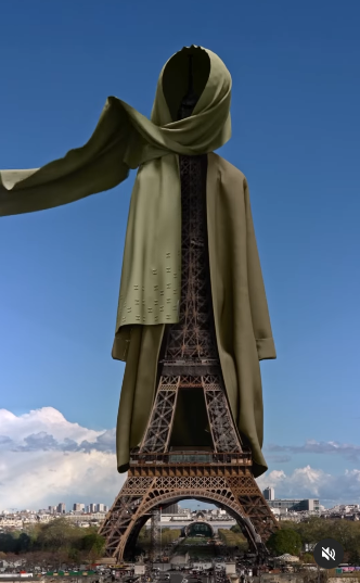La Tour Eiffel, symbole de la France, détournée par la marque Merrachi qui la couvre d’un voile islamique dans une publicité provocatrice.