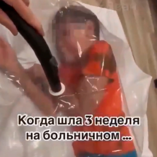 Στο βίντεο της γυναίκας από το Σάρατοβ, φαίνεται το παιδί να είναι μέσα στη σακούλα και τη μητέρα του να βάζει τη σκούπα για να ρουφήξει τον αέρα προκειμένου, όπως είπε στους followers της, να του χαρίσει μια ξεχωριστή εμπειρία.