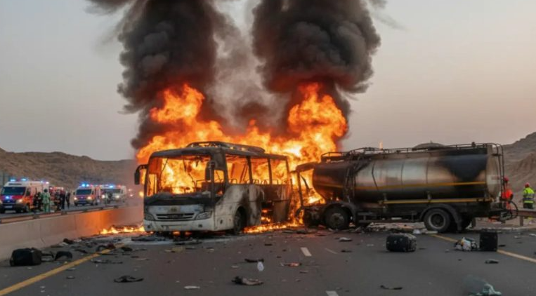 Λεωφορείο που μετέφερε προσκυνητές του Ουμρά συγκρούστηκε με βυτιοφόρο ντίζελ κοντά στη Μεδίνα με αποτέλεσμα να πάρει φωτιά ολοσχερώς.