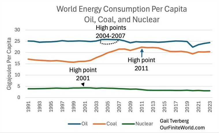 Η πτώση στην κατανάλωση ενέργειας ανά άτομο, όπως φαίνεται στις παρατηρήσεις για την κατανάλωση πετρελαίου και άνθρακα, δείχνει μια ανησυχητική τάση για την παγκόσμια οικονομία, η οποία επηρεάζει άμεσα τη δυνατότητα των χωρών να αναπτύξουν νέες υποδομές ή να διατηρήσουν τις υπάρχουσες.