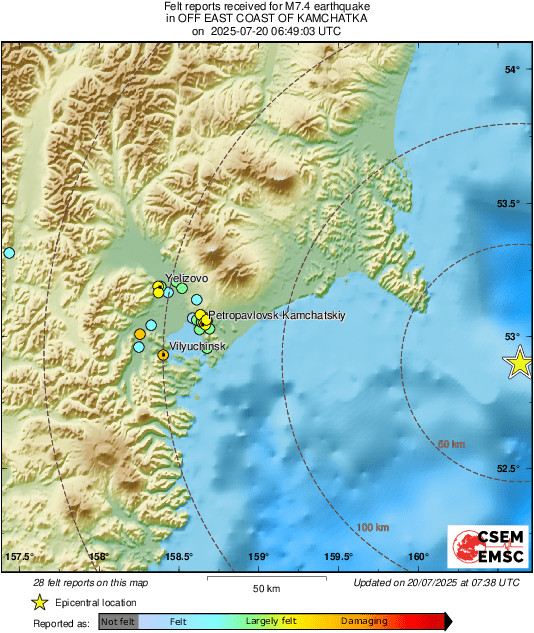 Δύο σεισμοί 6,7 και 7,4 βαθμών αντίστοιχα σημειώθηκαν σήμερα ανοιχτά των ακτών της Καμτσάτκα, στη Ρωσική Άπω Ανατολή, οι οποίοι οδήγησαν στην έκδοση προειδοποίησης για τσουνάμι, σύμφωνα με το αμερικανικό ινιστιτούτο γεωφυσικής USGS.