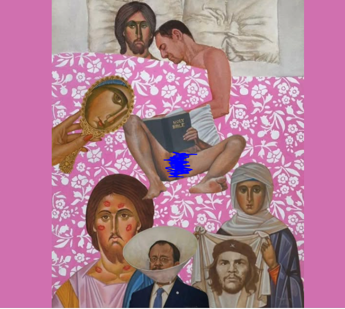 Βέβηλη έκθεση κατά Χριστού, Παναγίας στην Κύπρο! Aκυρώθηκε η έκθεση στην Πάφο! Ο ζωγράφος Γιώργος Γαβριήλ στην Κύπρο ευαγγελίζεται έναν Αντίχριστο γιατί ο αντί Χριστού είναι Αντίχριστος.. Παρουσιάζει τον Χριστό σε περιπαθή εναγκαλισμό με ομοφυλόφιλο γυμνό ξαπλωμένο σε κρεβάτι. Δείχνει τα γεννητικά όργανα ανδρός στο Χριστό..Και λέει δεν είναι χυδαιότητα το έργο του και ότι δεν είναι επίθεση στα θεία.. Ναι αν γι αυτόν ο Χριστός δεν είναι Θεός..