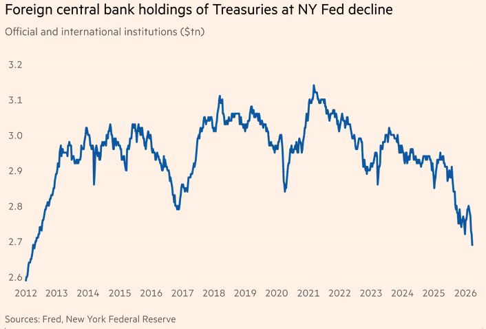 Οι ξένες κεντρικές τράπεζες πωλούν αμερικανικά ομόλογα σε μια περίοδο που η αγορά ομομολόγων ήδη πιέζεται, καθώς οι επενδυτές ανησυχούν ότι η σύγκρουση στη Μέση Ανατολή μπορεί να ενισχύσει τον πληθωρισμό. Αυτό έχει οδηγήσει τις αποδόσεις των διετών και δεκαετών ομολόγων να αυξηθούν μέσα στον μήνα με τον μεγαλύτερο ρυθμό από το 2024, αυξάνοντας το κόστος δανεισμού για το κράτος, τις επιχειρήσεις και τα νοικοκυριά.