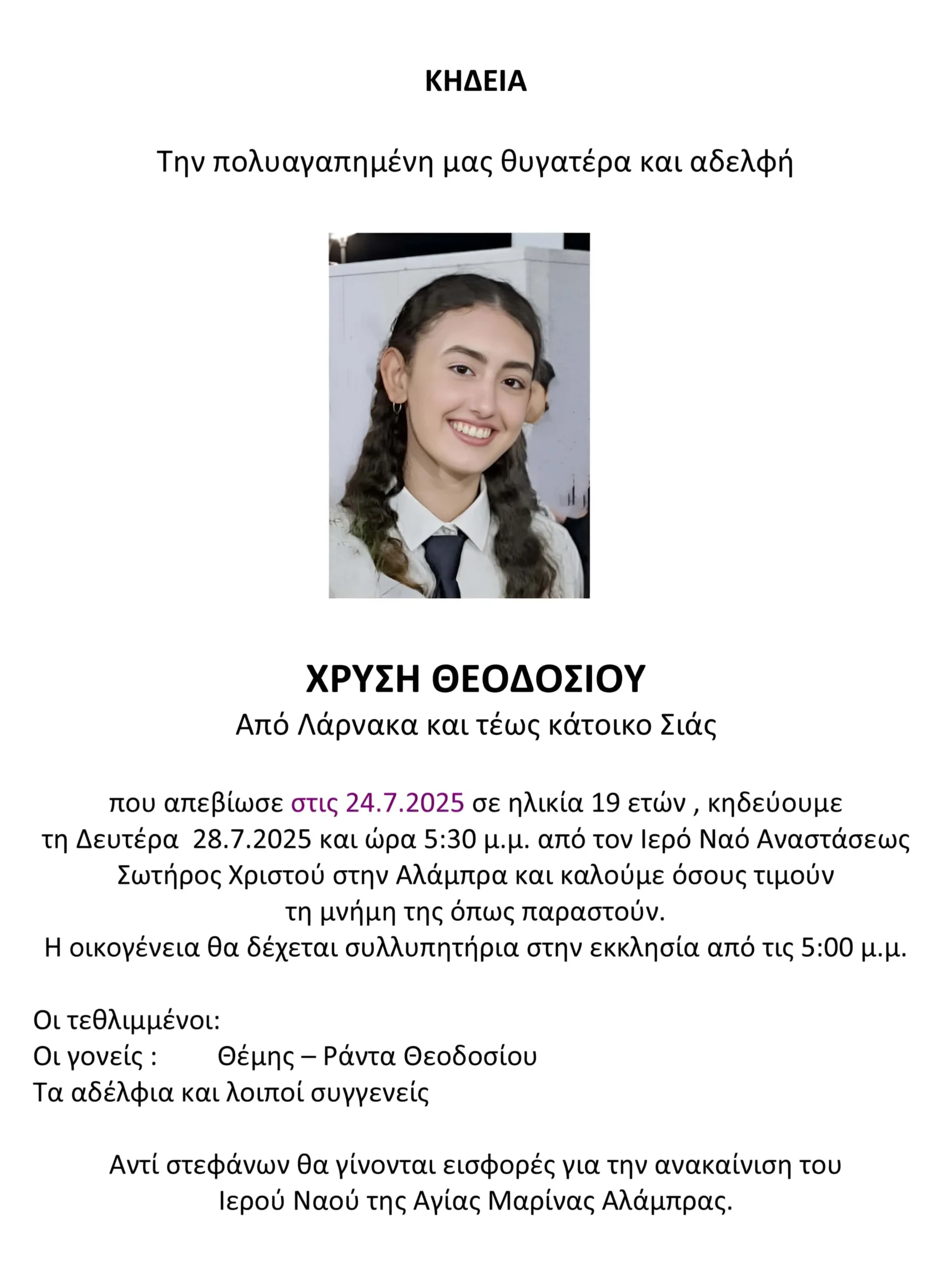 Βαρύ πένθος στο Πανεπιστήμιο Κύπρου για τον πρόωρο χαμό της 19χρονης φοιτήτριας Χρυσής Θεοδοσίου – Συγκλονισμένοι συμφοιτητές και καθηγητές Με βαθιά θλίψη το Πανεπιστήμιο Κύπρου και ειδικότερα η Υπηρεσία Σπουδών και Φοιτητικής Μέριμνας αποχαιρετούν τη φοιτήτριά τους, Χρυσή Θεοδοσίου, η οποία έφυγε πρόωρα από τη ζωή σε ηλικία μόλις 19 ετών.