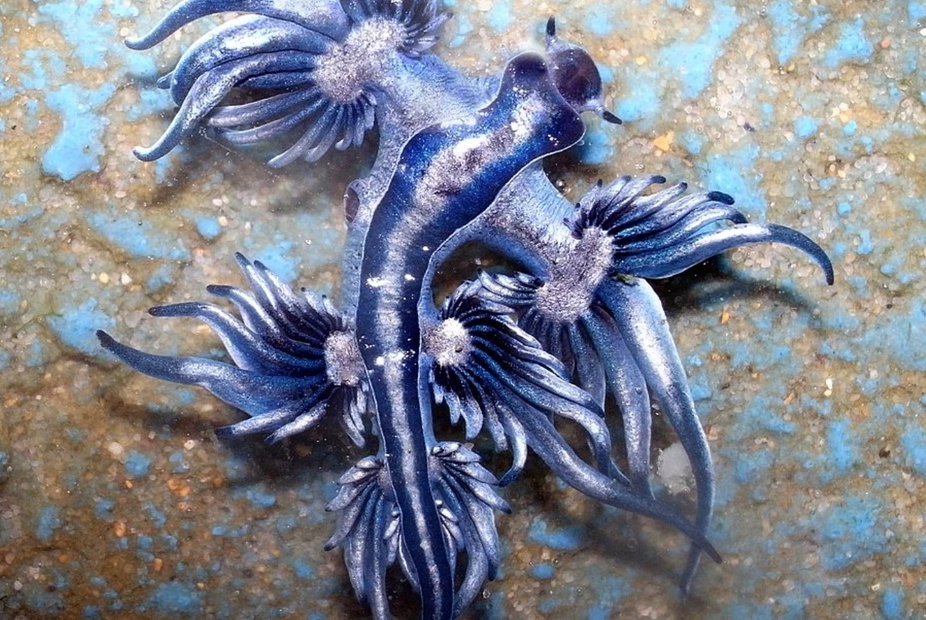 Το θαλάσσιο γυμνοβράγχιο, γνωστό ως Glaucus atlanticus, τρέφεται με τη θανατηφόρα «πορτογαλική καραβέλα» (Portuguese man o’ war) και άλλα δηλητηριώδη θαλάσσια όντα. Το εκθαμβωτικό μπλε πλάσμα απορροφά τα κεντριά από την τροφή του και τα αποθηκεύει σε συμπυκνωμένη μορφή, αποκτώντας πολύ πιο ισχυρό τσίμπημα από το ίδιο του το θήραμα.