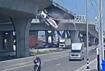 Ένα σοκαριστικό βίντεο καταγράφει τη στιγμή που μια μπετονιέρα χάνει τον έλεγχο, εκτρέπεται της πορείας της και πέφτει από υπερυψωμένο δρόμο στην Ταϊλάνδη.