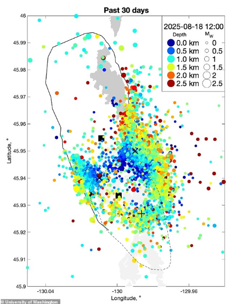 Πρόσφατες σεισμικές σαρώσεις από το Πανεπιστήμιο της Ουάσινγκτον έχουν εντοπίσει εκατοντάδες μικρούς σεισμούς γύρω από το υποθαλάσσιο ηφαίστειο.