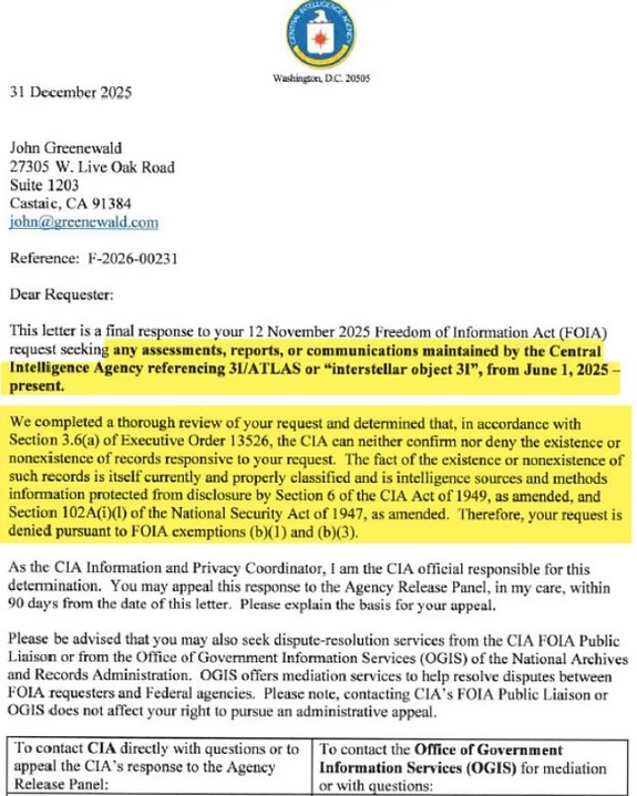Απαντώντας σε αίτημα του Νοεμβρίου 2025 του Νόμου περί Ελευθερίας της Πληροφόρησης (FOIA) σχετικά με τον φερόμενο κομήτη, η CIA δήλωσε ότι δεν μπορούσε «ούτε να αρνηθεί ούτε να επιβεβαιώσει την ύπαρξη ή μη ύπαρξη αρχείων» σχετικά με τον 3I/ATLAS.